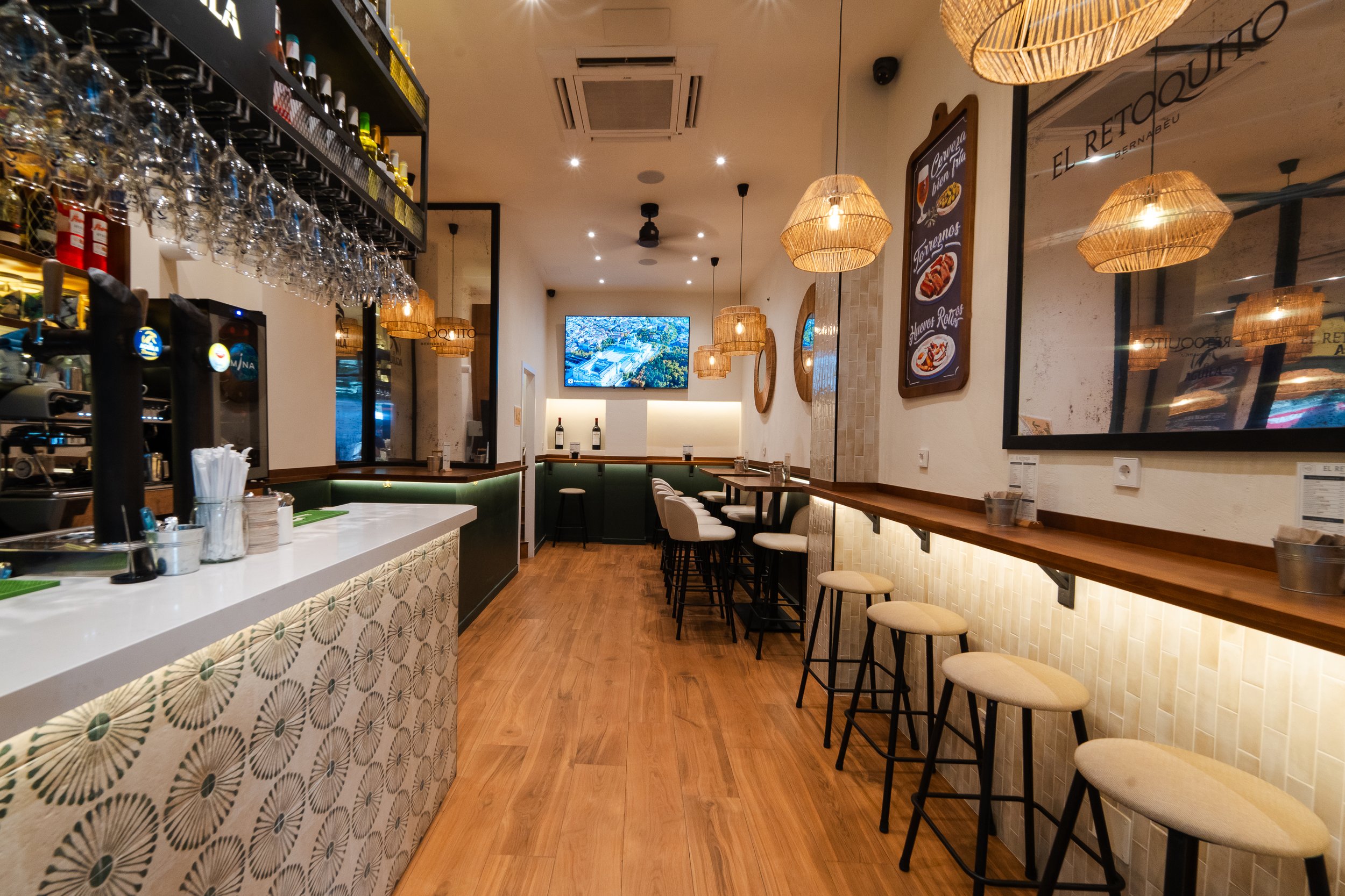 A escasos metros del Estadio Santiago Bernabéu, al lado de nuestro local El Retoque, nace su hermano pequeño, El Retoquito, un espacio pensado especialmente para la celebración de eventos privados. El local, además de disponer de una zona diáfana interior, también cuenta con una terraza exterior con capacidad para 40 personas